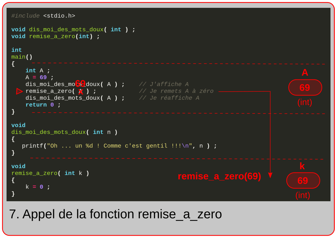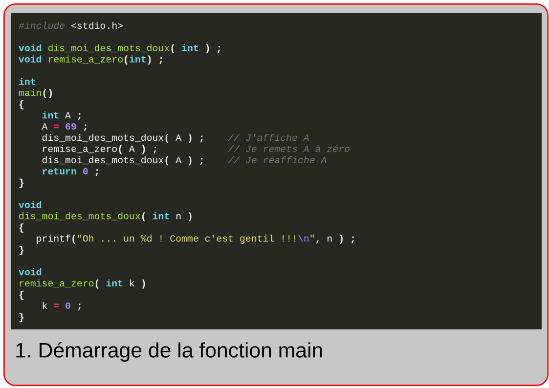 Voyons maintenant comment se fait l’appel de la fonction remise_a_zero dans la fonction main :