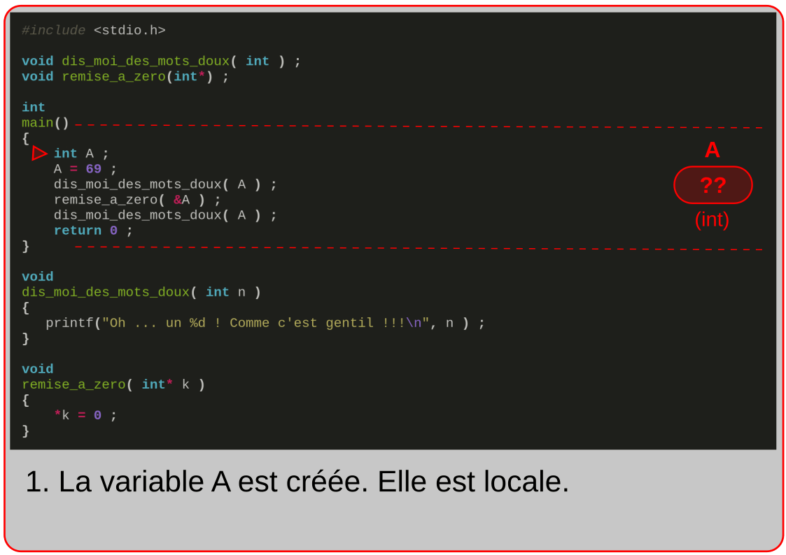 C’est là que les pointeurs entrent en jeu : au lieu de transmettre la valeur de A, nous allons transmettre son adresse, afin que la fonction appelée puisse savoir où écrire. Et les adresses, nous les manipulons avec ce nouveau type de variable que nous avons vu la dernière fois : le pointeur !